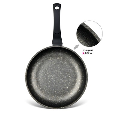 • Поверхня гладка, з золотими вкрапленнями. Сковороди ефектно виглядають і здатні стати прикрасою будь-якої кухні.